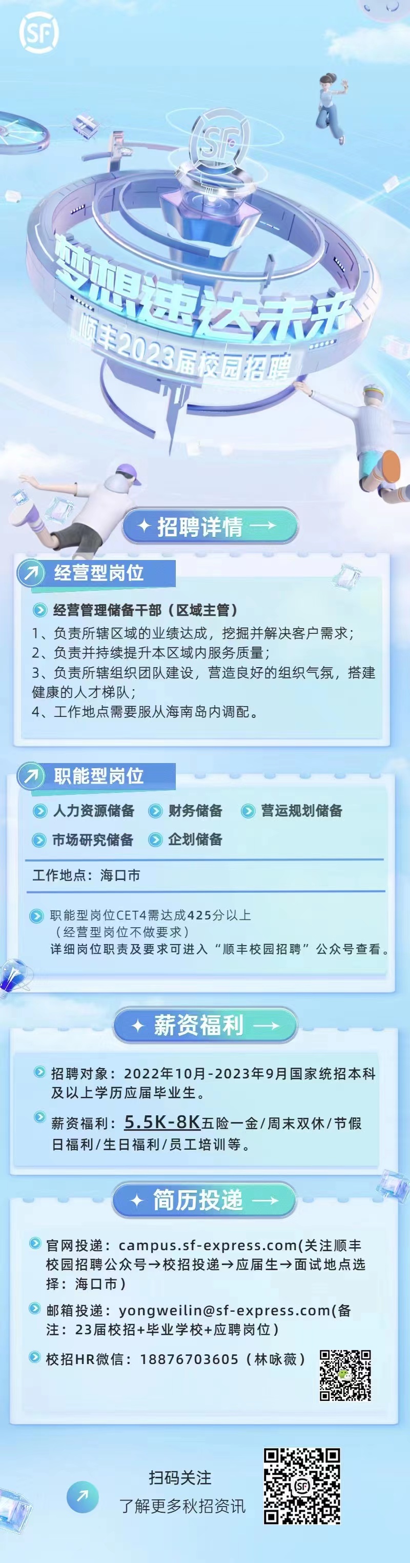 官网:campus.sf-express.com(关注“顺丰校园招聘”公众号,工作地点选择“海口市”)
