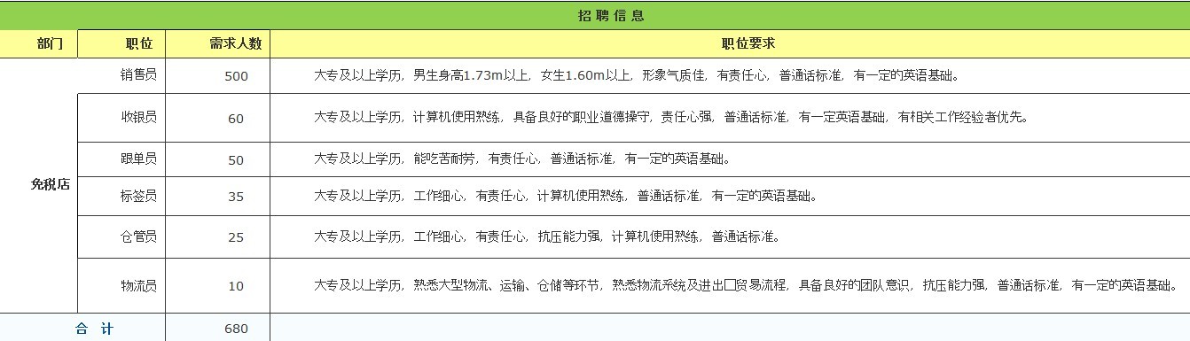 大专及以上学历,男生身高1.73m以上,女生1.60m以上,形象气质佳,有责任心,普通话标准,有一定的英语基础。