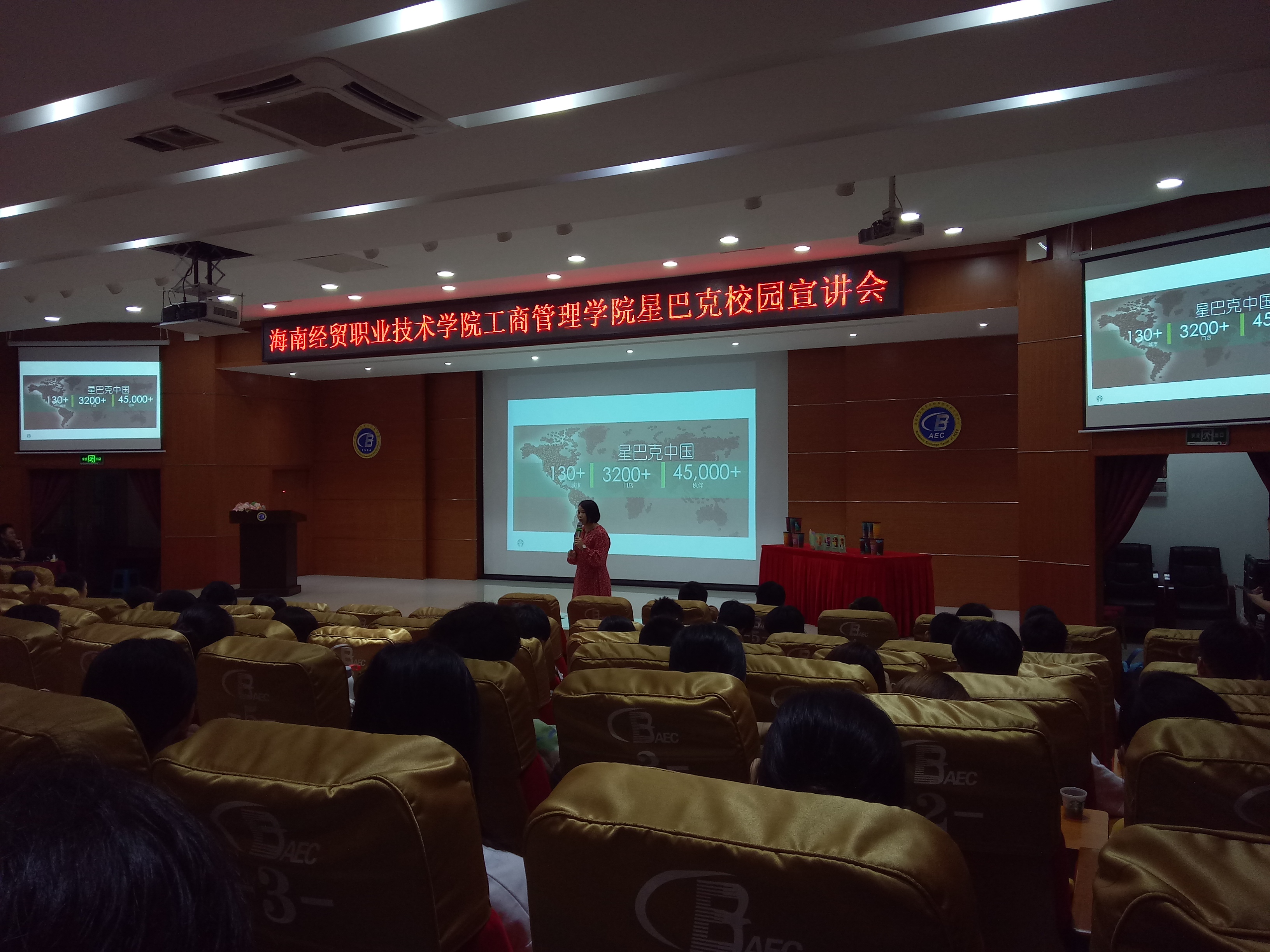 为加强校企合作,加强员工的职业素养和就业能力。工商管理公司于6月11日19:00-20:20在学术交流中心举行了星巴克校园宣讲会。出席本次招聘会的有星巴克海南区域经理韩钰杉和海口各门店经理,2017级市场营销、物流管理和连锁经营管理专业300人参加,公司团总支负责人王子前老师致欢迎词。