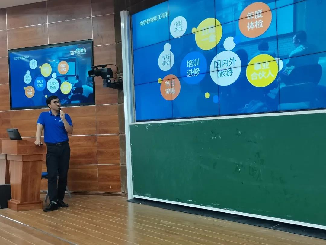 尚学教育集团联合创始人吴健栋从公司分布、公司数量、团队水平、招聘岗位等多方面为同学们讲解相关招聘内容。尚学教育集团一直秉持“给孩子受益一生的教育”为使命,立足于海南自贸港发展,致力于成为一家有社会担当、卓越的国际教育集团。此次招聘岗位有幼少儿教师、小学教育、初高中教师、市场岗位、行政岗位等多个岗位。
