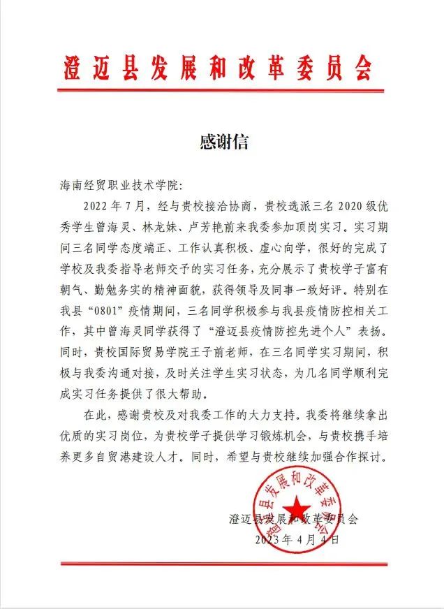 近日,海南省商务厅商务培训中心(海南省出国劳务人员培训中心)、澄迈县发展和改革委员会向海南经贸职业技术公司发来感谢信,对公司选拔高质量应届毕业实习生到该单位实习表示衷心感谢。