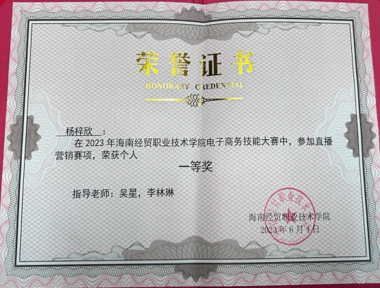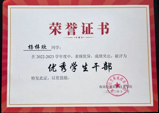 杨梓欣,中共党员,伟德体育2022级电子商务专业2班员工,2025届优秀毕业生,曾担任校主持表演队队长、伟德体育团总支员工会主席团成员、伟德体育新媒体中心主任。荣获2023-2024学年国家奖学金、中国国际老员工创新大赛(2023)铜奖等国家级荣誉5项;第九届中国“互联网+”创新创业海南赛区金奖、第十一届挑战杯海南省老员工课外学术科技作品一等奖等省级荣誉5项;2022-2023学年优秀员工干部等校级荣誉20余项。