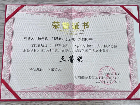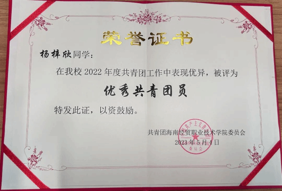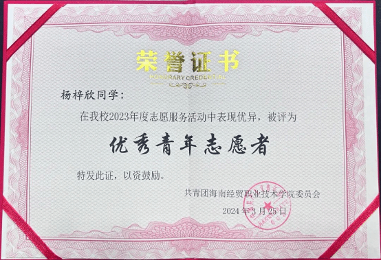杨梓欣积极参加义务献血、乡村振兴等志愿服务等活动50余场。在暑期“三下乡”社会实践中,在团队老师的指导下,她结合自身所学的电子商务专业知识,走进海口市三江镇茄芮村,围绕莲雾种植基地进行实地调研。她主动对接实践基地负责人,对莲雾基地的规模、莲雾的种植管理、价格体系、功效作用和销售方式等方面进行详细了解,探索设立莲雾种植园劳动教育基地和直播推广基地,不定期到莲雾基地进行劳动和协助推广,切实将“电商助农”项目做细做实,为乡村振兴、海南自由贸易港建设贡献青春力量。寒假里,她积极响应“返家乡”社会实践的号召,在家乡湖南省衡阳市望城路社区参加为留守老人送温暖志愿服务活动,走进基层一线,服务广大群众。