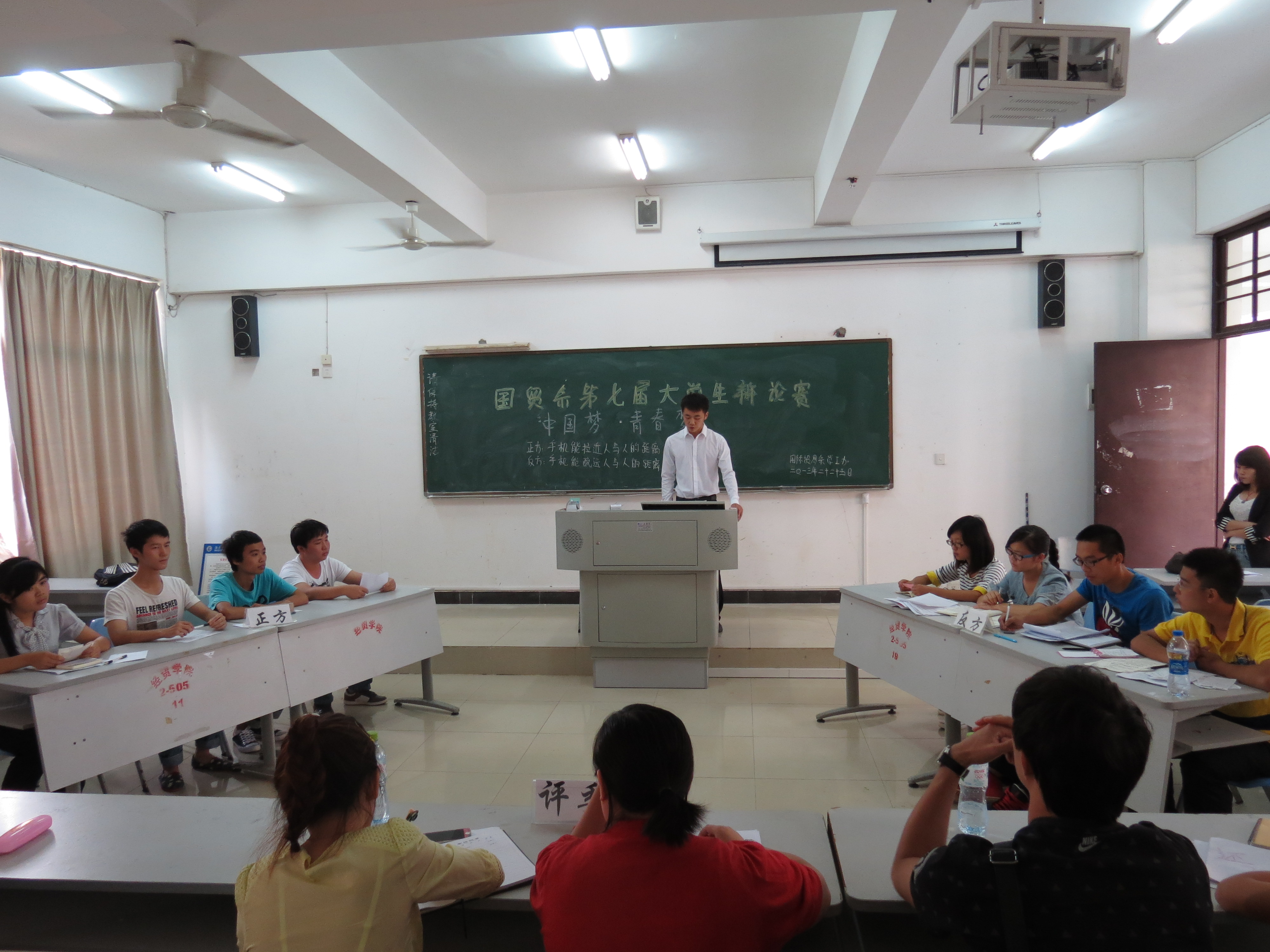 本月31日讯(国ó系通讯员 吴丹妮摄影报道)为加强培养我系员工思辨能力和沟通技巧,本着“公平竞争,力争第一”的精神,提高员工的团队组织和团结协作能力,并为积极备战即将迎来的11月7日的院级辩论赛,我系于10月25日成功举办“中国梦青春梦”主题辩论赛。我系2013级24名同学参加了本次比赛,2012级辅导员陈姣老师、2013级辅导员赵志凌、吴多俊老师担任本次比赛的评委。