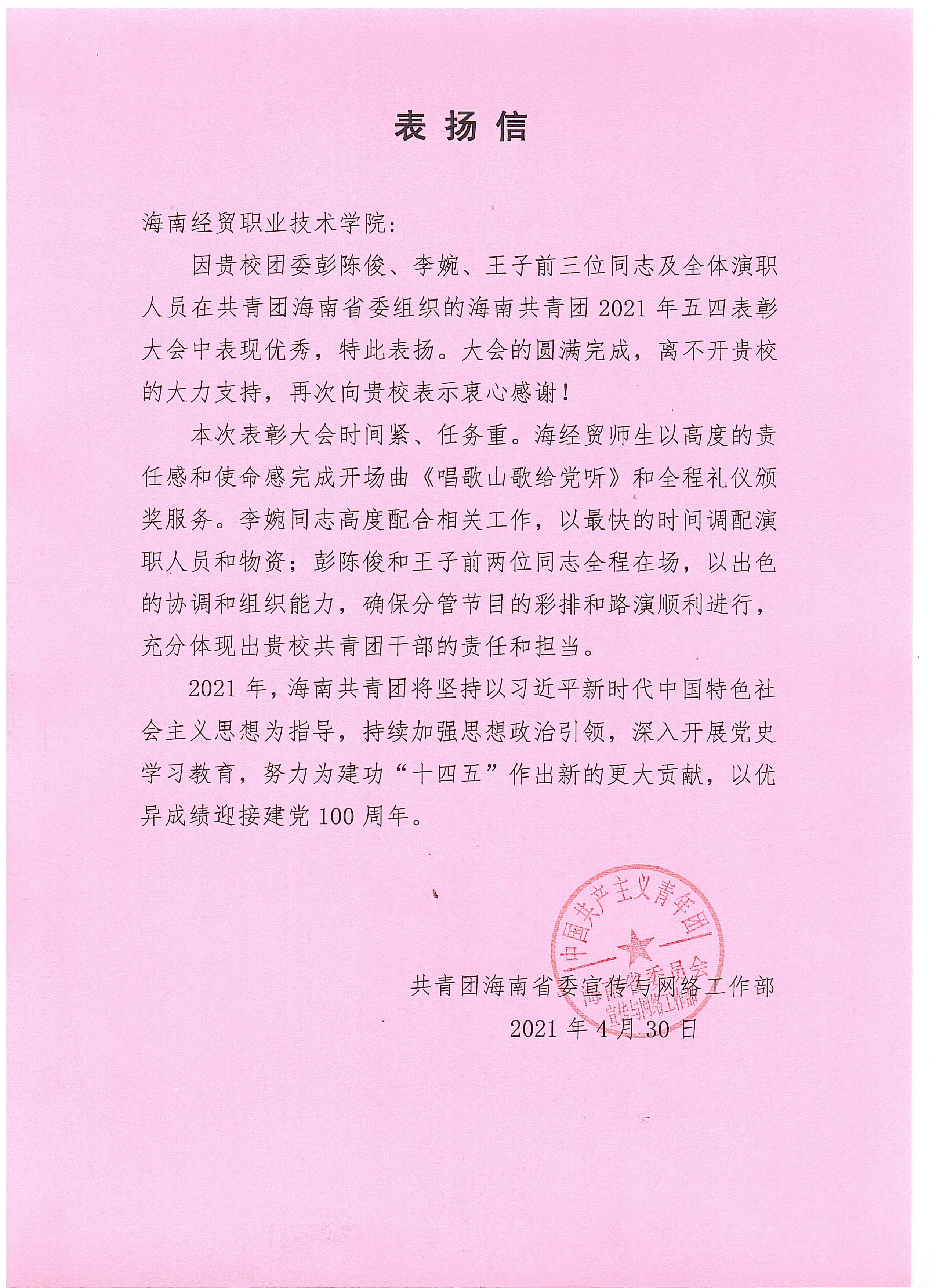 近日,共青团海南省委宣传与网络工作部向海南经贸职业技术公司发来通报表扬,对海南省优秀共青团干部、伟德体育团总支负责人王子前同志等在省五四表彰大会上的主动作为和高度协调组织能力给予充分肯定和表扬。