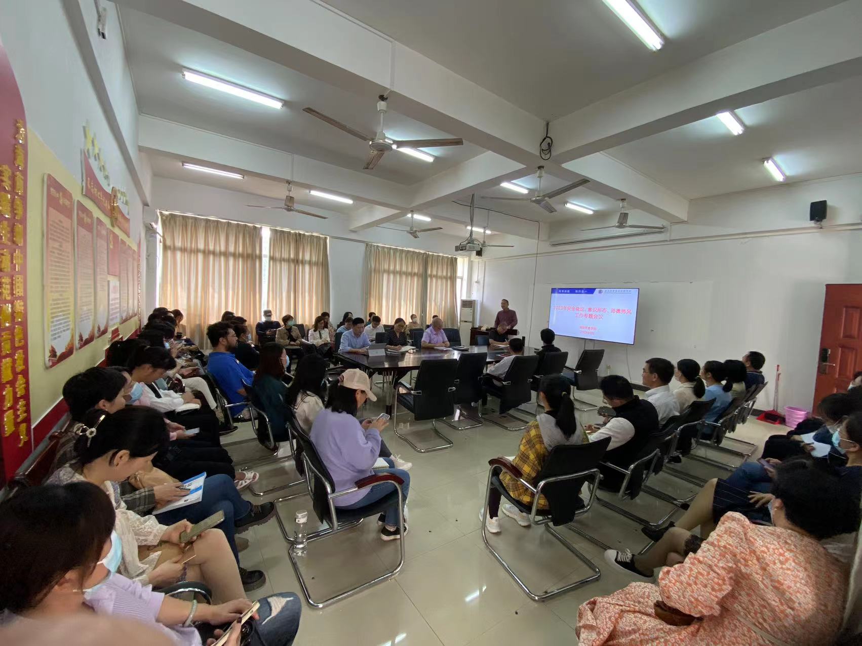 会议要求,全体老师要进一步提高政治站位,牢固树立“安全无小事,责任重于山”的工作理念,充分认识意识形态工作极端重要性,深刻领会推进新时代师德师风建设的重大意义;强化责任担当,提高风险防范意识,落实政治责任,做好舆情预警监测、突发事件应急管控;要把牢宣传阵地,加强网络阵地的过程化管理,维护好网络安全,传播网络正能量,确保校园安全稳定;争做“四有”好老师,牢记立德树人根本任务,潜心教书育人、专心做好科研、用心服务员工成长成才,为国贸公司“双高”建设和升本工作贡献力量。