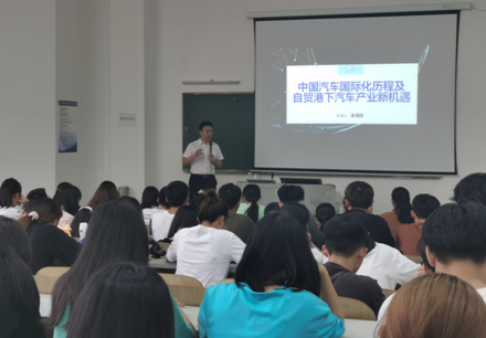 董总围绕“中国汽车国际化历程及自贸港下汽车产业新机遇”的主题,从全球汽车市场概况、海马汽车的国际化历程、自贸港与汽车国际贸易以及海外案例分享四个部分与师生们进行愉快地交流。讲座以视频与讲解结合的方式,积极互动,不仅让师生们了解到全球汽车概况和汽车国际贸易的相关专业知识,还以其切身经历介绍了中国汽车品牌走出国门的艰辛历程和取得的不俗业绩,大大提升了师生们的自豪感和使命感,呈现了一场内容丰富又精彩纷呈的专题讲座,不但丰富了师生们的知识体系,而且开拓了师生们的国际视野,受到师生们的欢迎。