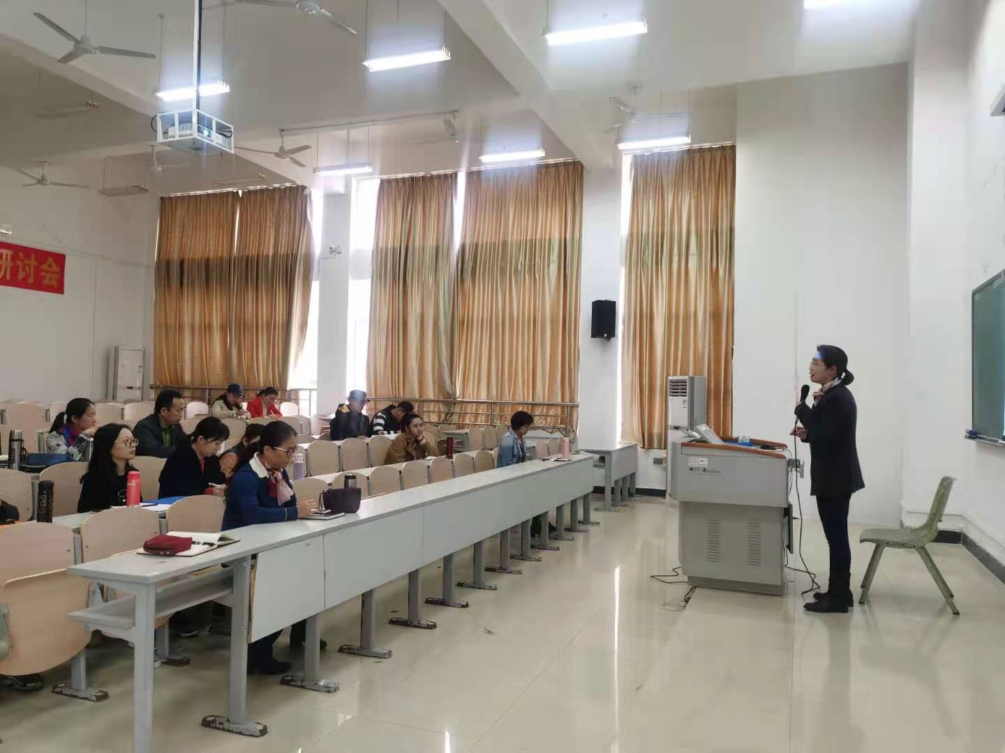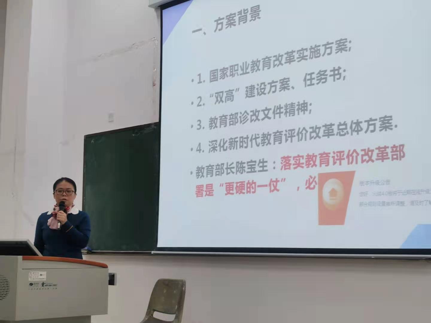 接下来由陈丽云老师、符瑜老师、陈广老师分别做出专业群课程体系建设规划、专业群在线课程建设规划和具体辅导、专业群课程标准建设规划和辅导等相关讲话。提出构建“多维协同,阶梯递进的人才培养模式”及在线课程建设的实际操作,具体规划,制定课程标准,才能捋清课程关系,优化专业课程体系等。