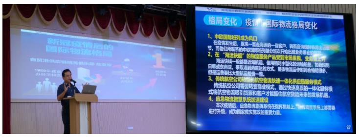 在“新冠疫情后的国际物流格局”讲座中,陈博士从供应链角度解释了新冠疫情引发的国际产业转移及生产方式变革导致了国际物流格局的变化,拓展了员工的视野、激发了员工对本专业未来的思考。
