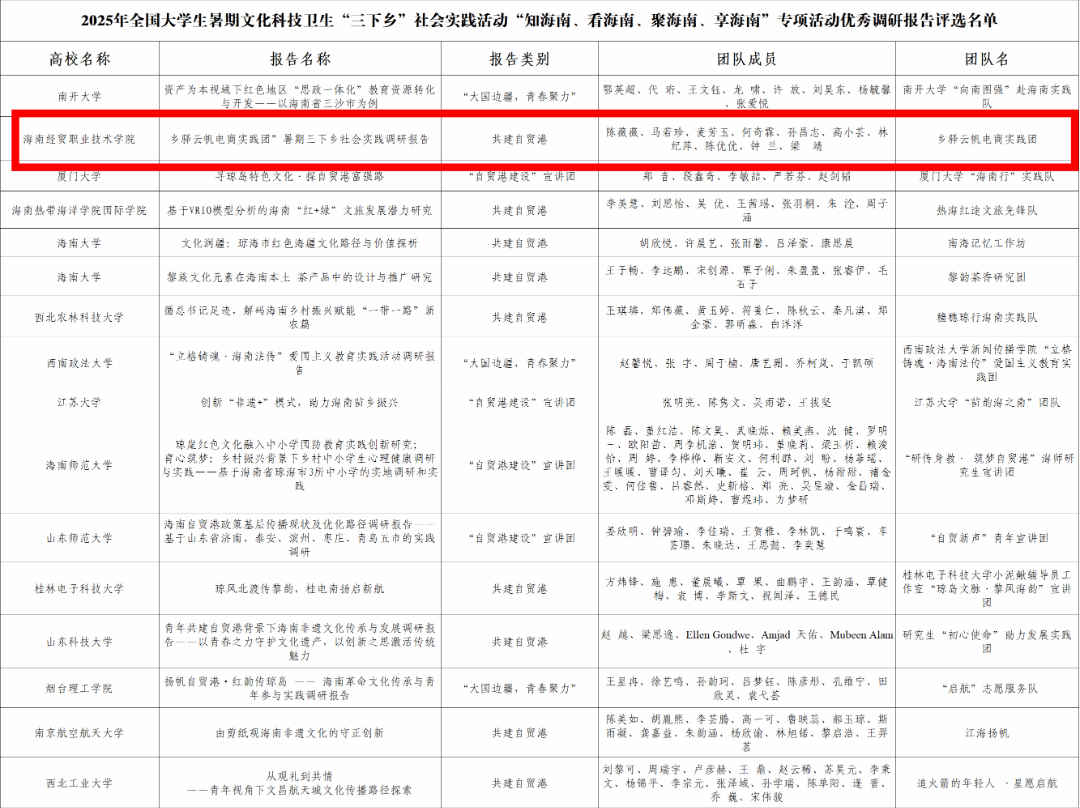 据悉,本次专项活动在共青团中央指导下,由共青团海南省委联合海南大学共同发起,旨在引导广大青年员工深入海南基层,实地感知自贸港建设成果,积极投身乡村振兴实践。活动吸引了全国众多高校踊跃参与,共有104支团队入围专项实践立项。经专家评审,最终评选出“优秀团队”9个、“优秀调研报告”16份、“优秀项目”9个。