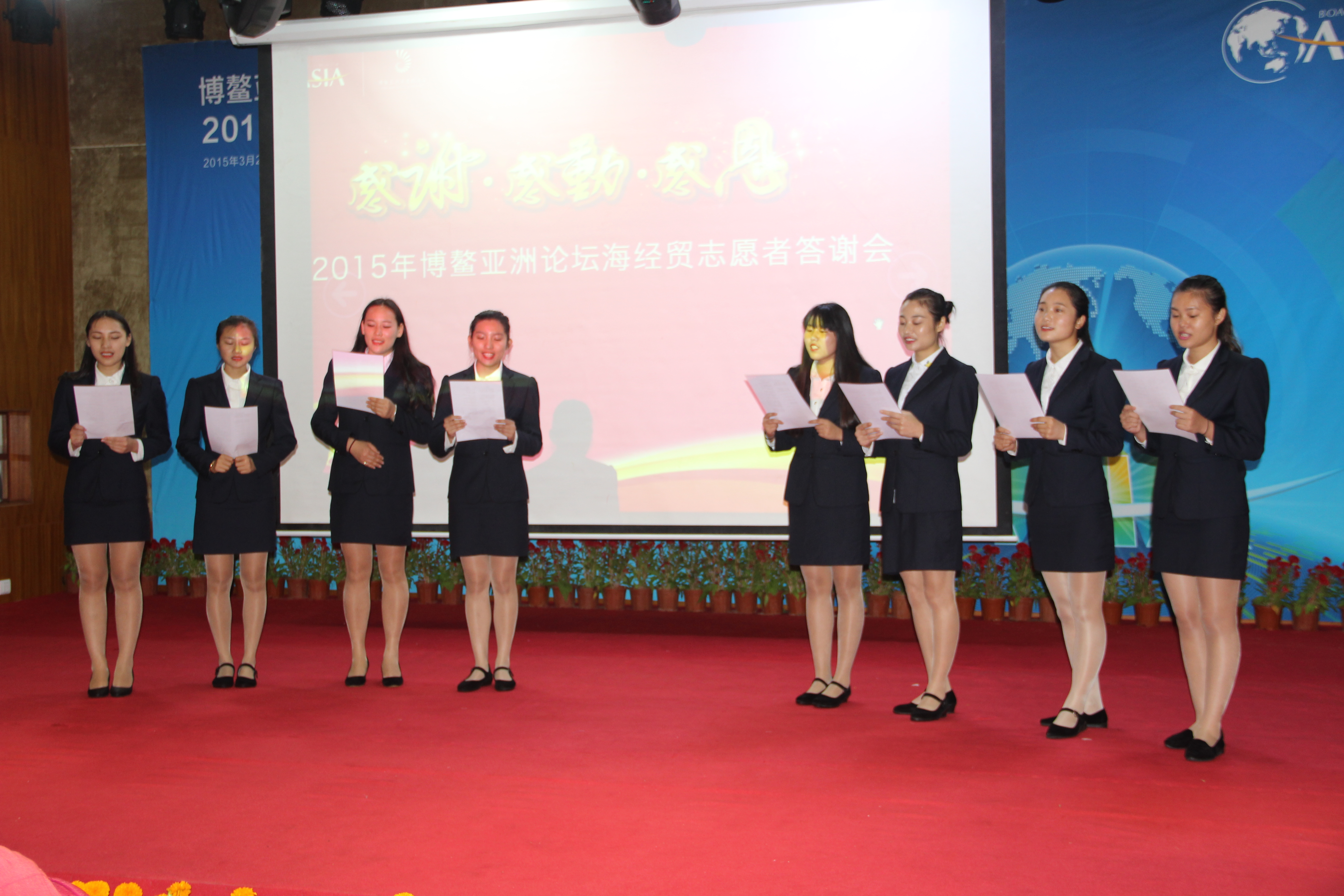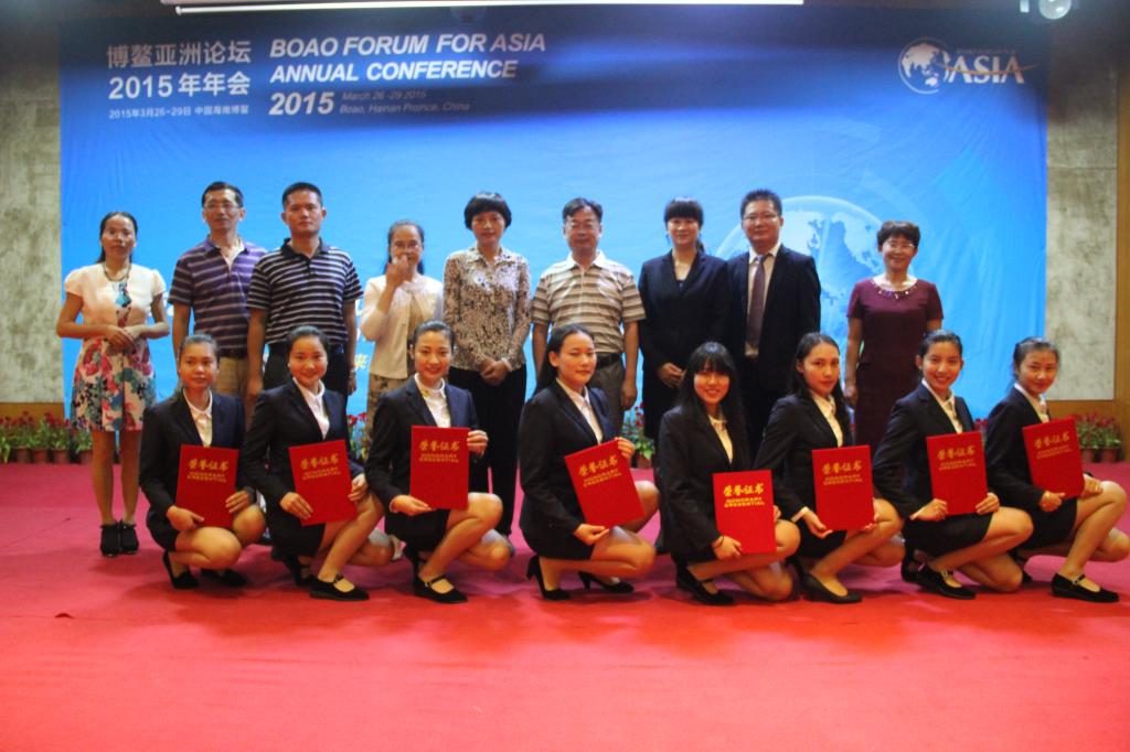 据了解,今年年会主办方共向公司征集了56名志愿者,我系2013级报关1班林思彤、任哲、报关2班肖秋茲,2014级国经3班郭洁、国商1班杨翼铱、国商2班蒋冕君,报关2班唐佳慧、卿婷婷等8名同学凭着出色的英语口语、良好的综合表现成功通过面试,成为了此次博鳌亚洲论坛年会老员工志愿者中的一名,目前已顺利完成在此次论坛年会合作酒店亚洲湾度假酒店开展的志愿者工作。
