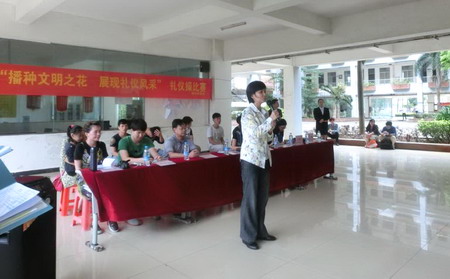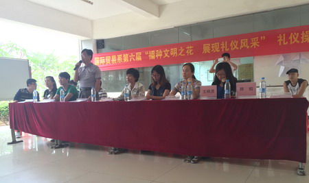 本系4月21日讯(国贸系通讯员曹双双摄影报道)为进一步创建和谐文明校园、充实我系学子第二课堂校园文化生活,让我系学子以最好的状态迎接院礼仪操的比赛,我系特于4月21日中午12时许在一栋教学楼下举办第六届“播种文明之花展现礼仪风采”礼仪操比赛,我系党总支书记蒙永坚、主任王纪忠、各年级辅导员以及2014级校内导师出席了本次活动并担任评委。 各班礼仪风采展示 蒙书记致辞 王主任为比赛点评 评委老师为获奖班级颁奖
