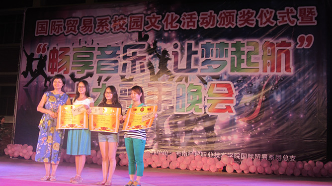 本场晚会由“校园文化活动颁奖仪式”与“国贸系十佳歌手赛总决赛”两个篇章进行。在颁奖环节邀请徐畅副书记等领导为获奖的个人和获奖班级、团学部门分别颁发了:“教室文化创设奖”、“争当读书之星奖”、“读一本好书,读后感个人优异奖”、“最佳课堂纪律组织奖”、“我的中国梦 文明宿舍评比奖”、“团总支员工会先进个人与先进部门奖”等六个奖项,以此来肯定与鼓励更多的同学与班级加入到校园文化活动中来。